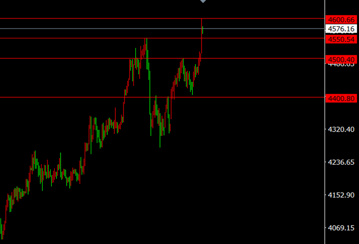 地缘政治风险的急剧上升,直接刺激了避险资产需求,推动现货黄金周一价格强势上涨,延续前两个交易日涨势 ,一度触及4600的历史新高,现交投于每盎司4570美元附近。技术面早盘金价急涨再创新高,短线伴随着快速回调 ,右侧耐心等待回调测试4550支撑情况,左侧我们暂时观望等待1月20日在做布局。